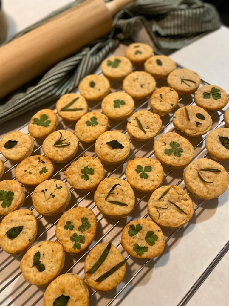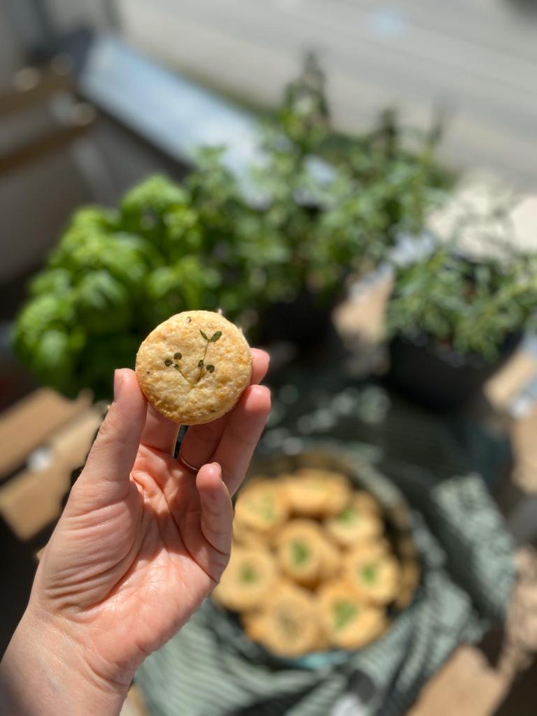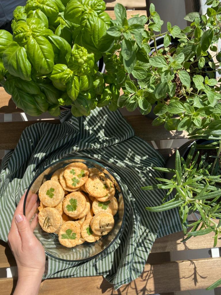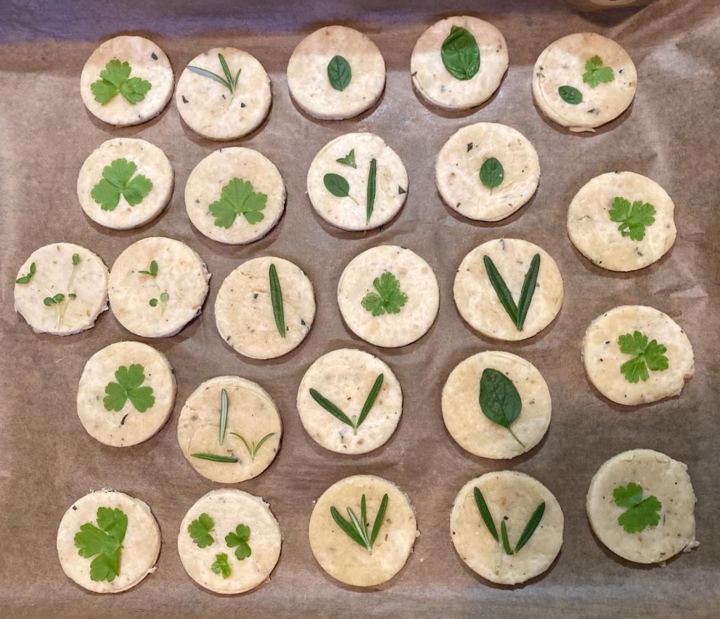 Modul în care am decorat acești biscuiți sărați mi-a amintit de cum decora bunica ouăle roșii de Paști – cu cele mai frumoase frunze pe care le găseam în grădină! Anul acesta am apucat să cumpăr câteva plante aromatice în ghiveci și mi-au prins tare bine, neavând o grădină.