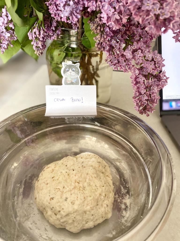 Într-un bol încăpător am pus toate ingredientele uscate, am amestecat și apoi am pus iaurtul și lingura de ulei. Cu o paletă de cauciuc am amestecat încet până a început să se prindă aluatul. Fiind cu iaurt, este un aluat mai lipicios și este nevoie să amestecam și cu mâna, așa ne asigurăm că înglobăm toată făina din vas. Dacă este mult prea lipicios și nu poți lucra cu el, presară puțină făină și mai frământă puțin cu mâna.