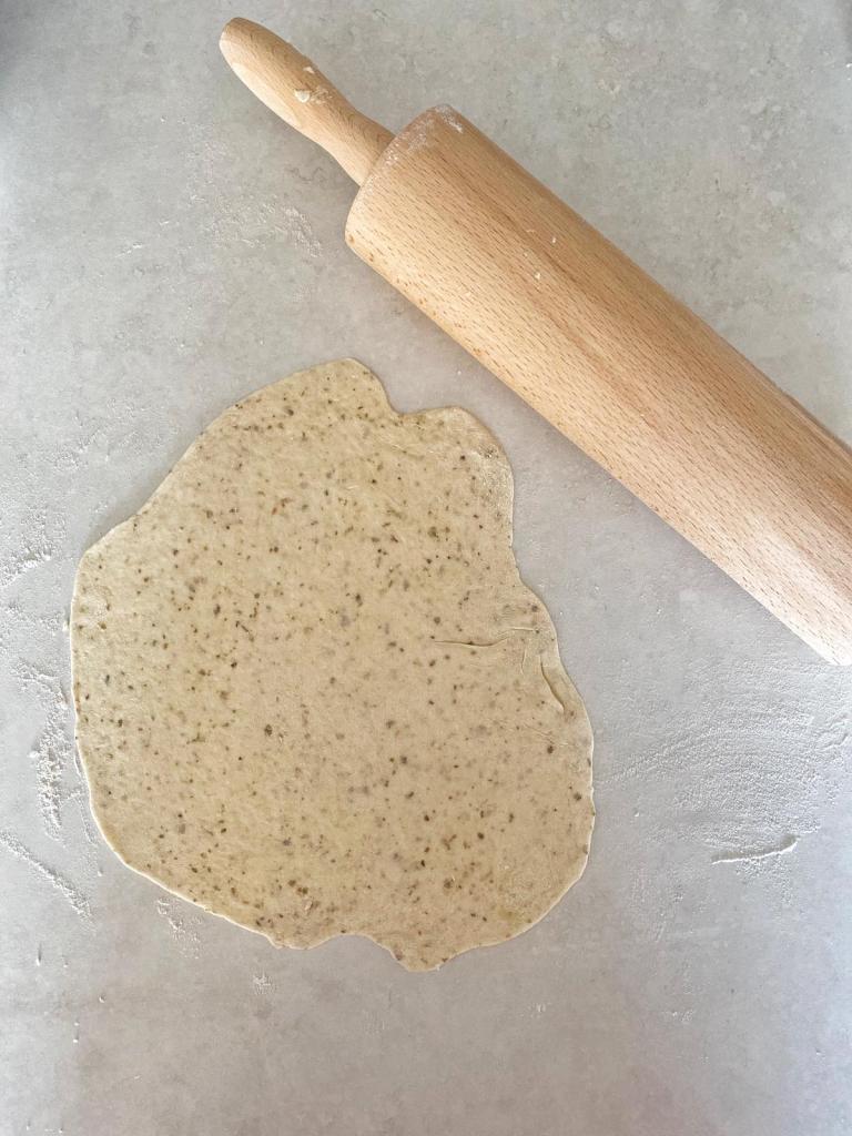 Am format o bilă din aluat și l-am lăsat acoperit cu o folie alimentară pentru aproximativ jumătate de oră, timp în care am pregătit ceva din pieptul de pui rămas.