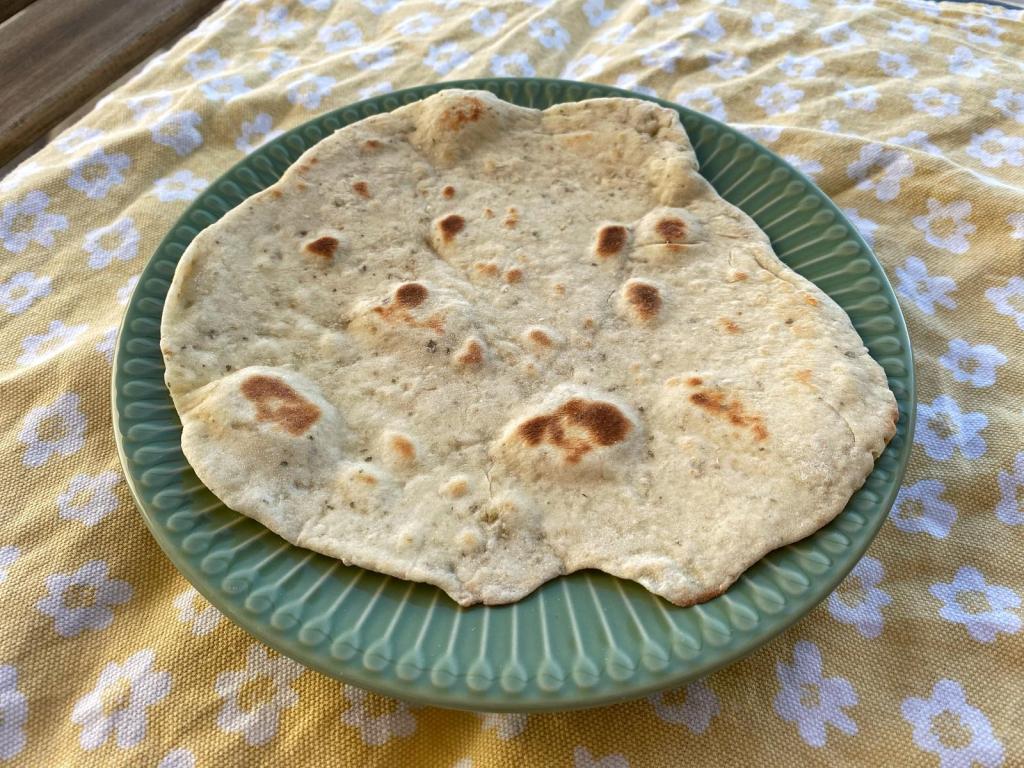 Aluatul l-am împărțit în patru și fiecare bucată în parte am întins-o cu un sucitor pe blatul de lucru (pe care deja aveam făină). În tigaia încinsă, lipia este gata cam în 2-3 minute / parte.