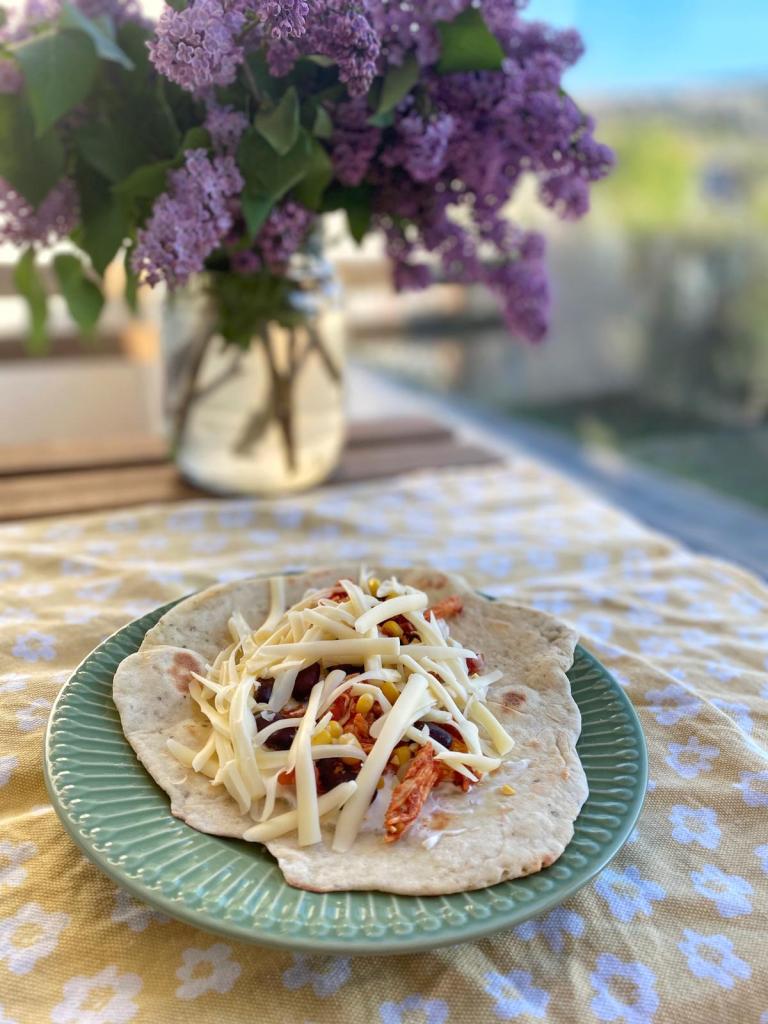 În lipie am pus o linguriță de smântănă, pui cu roșii și fasole, câteva boabe de porumb și muult caș ras!