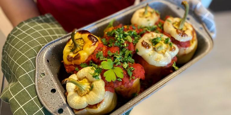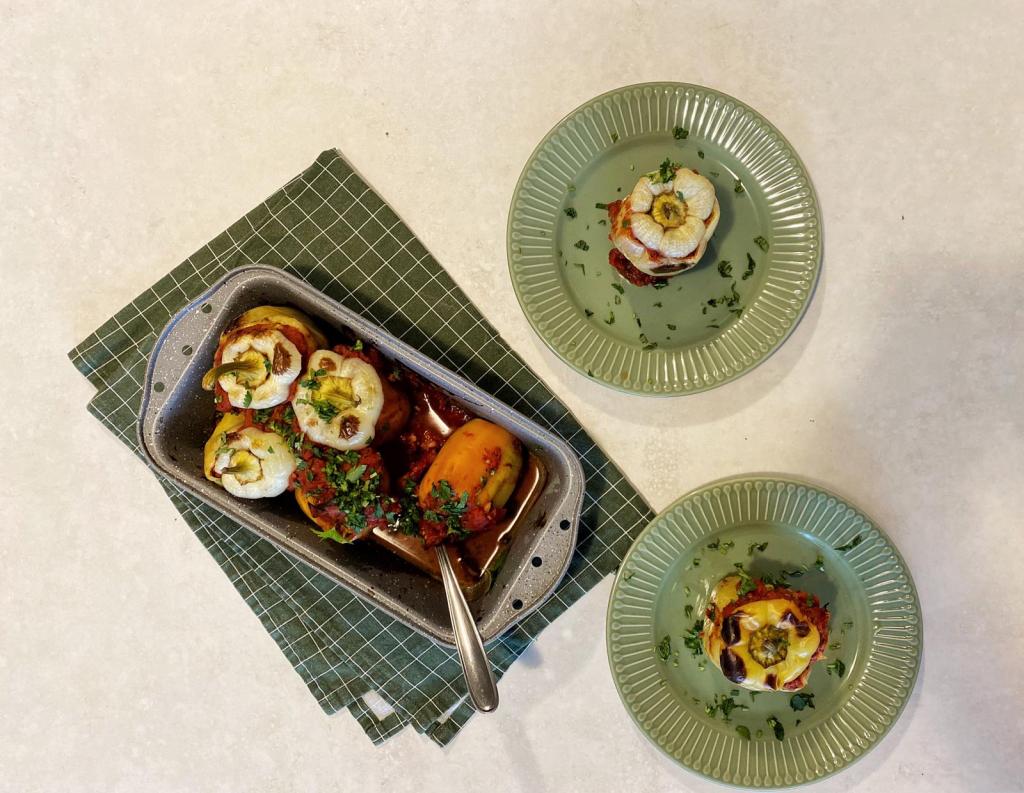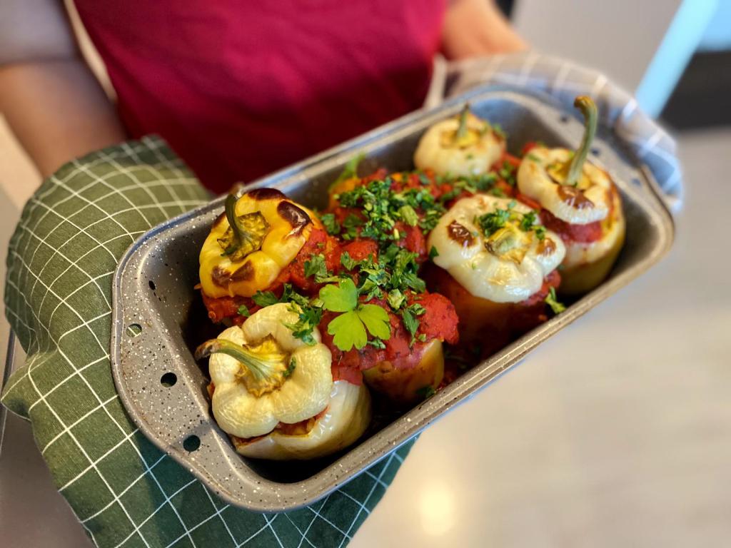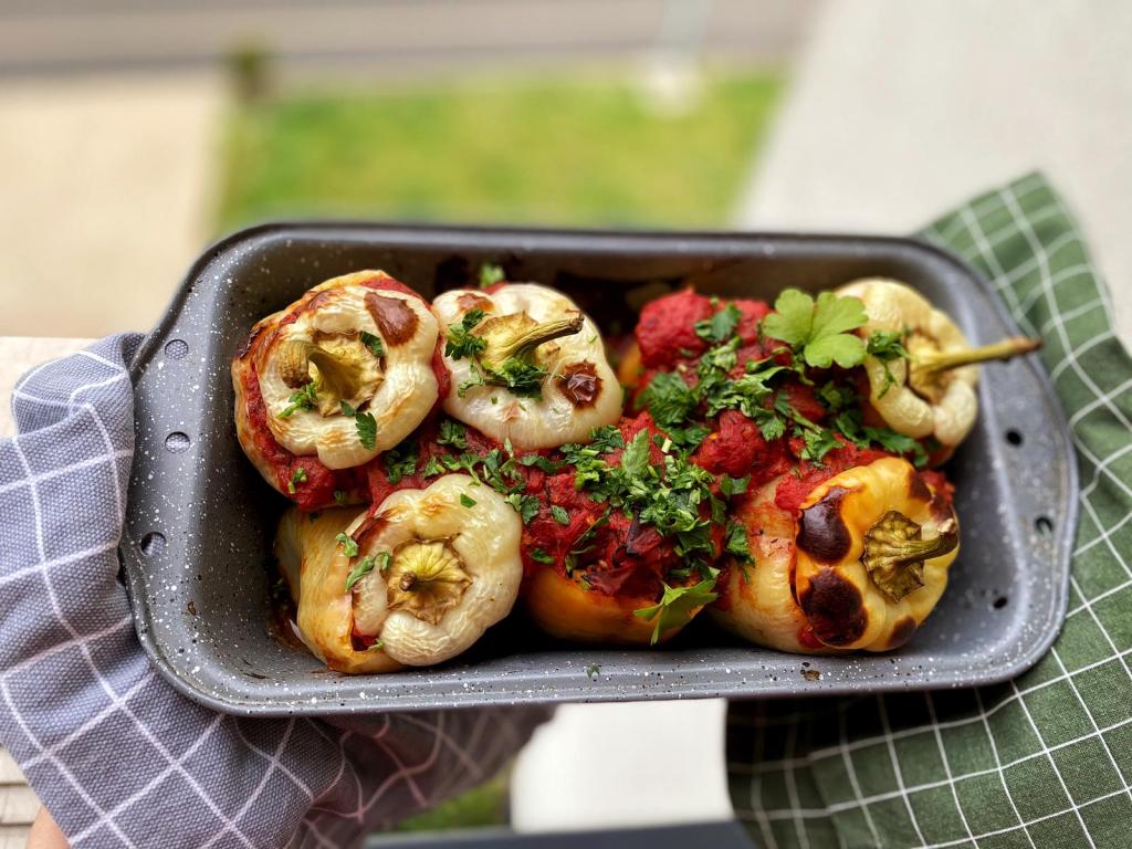 Când ardeii s-au fiert (25 minute), i-am mutat într-o tavă, am turnat sosul de roșii peste ei și i-am acoperit cu căpăcele lor. I-am pus la cuptorul preîncălzit la 180 grade, funcția ventilație și căldură de sus și jos, iar tava am așezat-o pe raftul 3 al cuptorului și am așteptat 20 minute.
