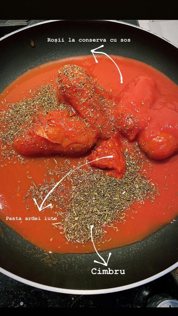 Între timp, am preparat sosul de roșii: într-o tigaie am pus conținutul unei conserve, o lingură de pastă de ardei iute și o lingură de cimbru uscat.