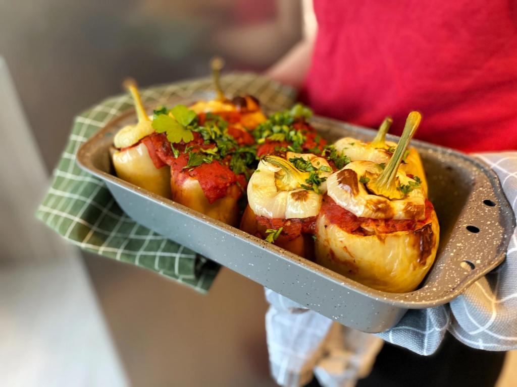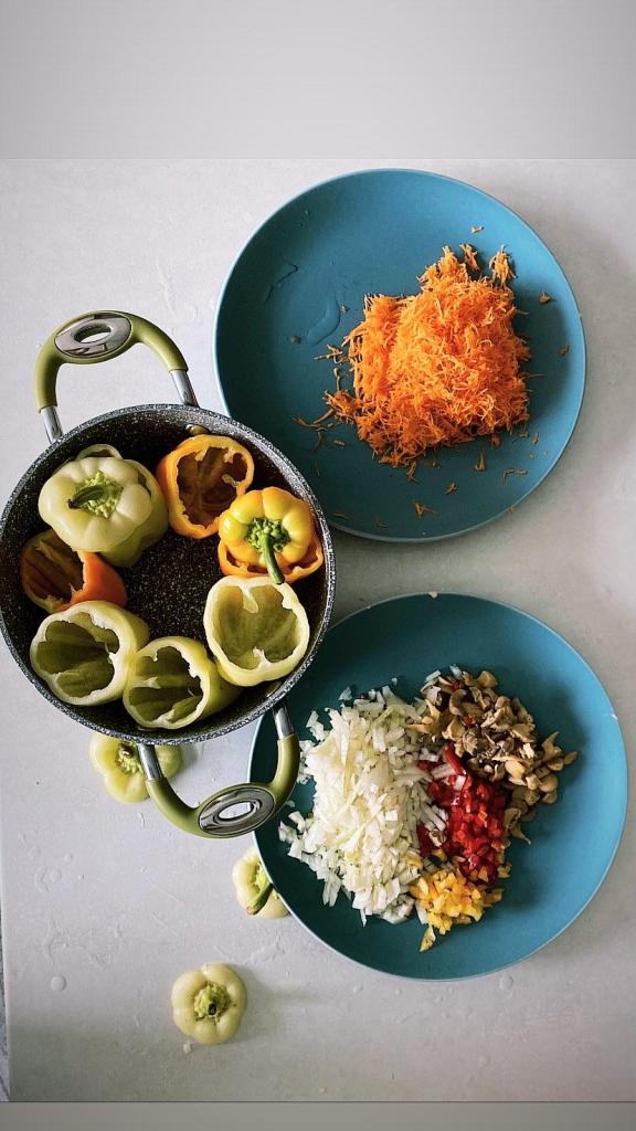 Am început cu pregătirea ardeiilor – după ce i-am spălat, am tăiat căpăcelul și am curățat semințele din ei. Căpăcelele le-am păstrat pentru decor – deci nu aruncăm nimic!