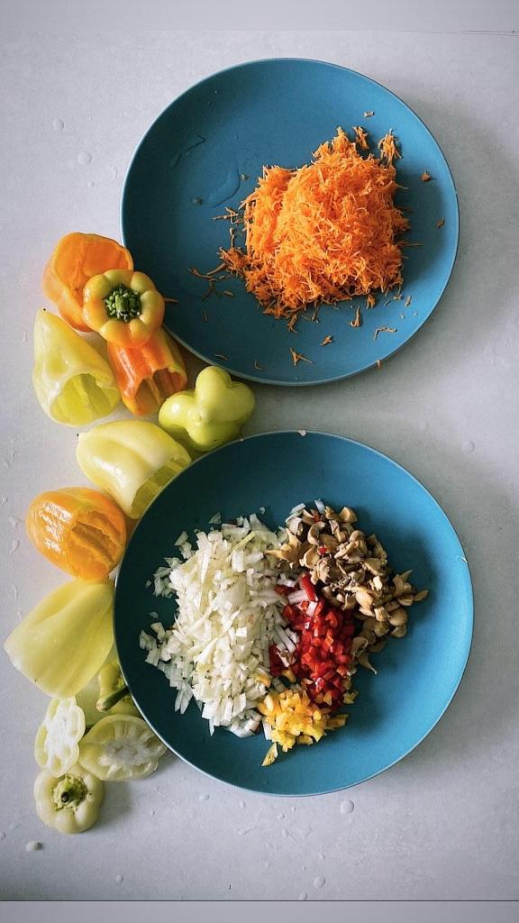 Într-o tigaie mare am pus uleiul și ceapa. După ce devine puțin transparentă (2-3 minute) putem pune ardeiul tocat și ciupercile. Am mai așteptat 3-4 minute, timp în care am tot amestecat și apoi am pus cei doi morcovi rași. Acum mai trebuie gătit câteva minute, până când morcovii devin mai deschiși la culoare, amestecând constant! Acum puteți condimenta cu: sare, piper, boia iute/ dulce (sau ambele) și cimbru, mult cimbru!