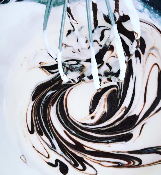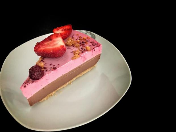 Brânza de vaci – care este la temperatura camerei – se amestecă cu smântâna lichidă, care între timp s-a mai răcit. O să mai ai nevoie de încă un bol în care vei turna jumătate din brânza cu smântână. Într-unul din boluri vei turna piureul de fructe și în celălalt ciocolata topiă. Amestecă bine fiecare compoziție până ai obținut o culoare uniformă.