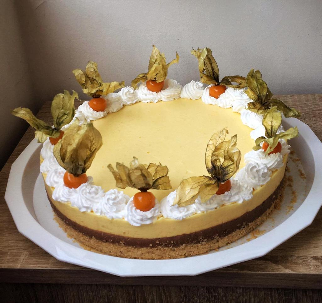 Acesta este tortul de care vă spuneam că l-am pregătit anul trecut pentru ziua mamei mele. M-am inspirat de la Ana, colega mea de bancă din clasele primare. Știu că mi-a trimis o poză cu un cheescake minunat în două culori – ciocolată și ananas cu mango. Arăta senzațional! Îmi amintesc perfect cum am stat cu ea la telefon să-mi explice pas cu pas cum fac eu să nu se amestece straturile? Care e smântâna bună pentru frișcă? Cum topesc gelatina? Practic, am făcut împreună, prin intermediul telefonului.