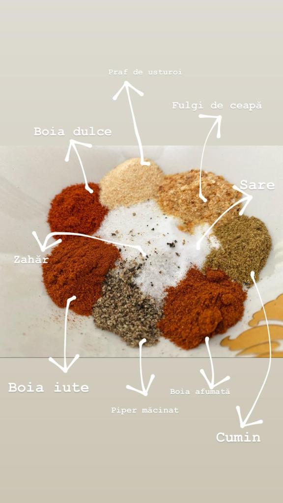 Primul lucru pe care l-am făcut este prepararea unui mix de condimente pentru carne. O să vă las o poză cu ce am pus, iar din fiecare condiment am folosit aproximativ jumătate de linguriță. Eu am avut 2 bucăți de costiță, cum se vede și în poză.
