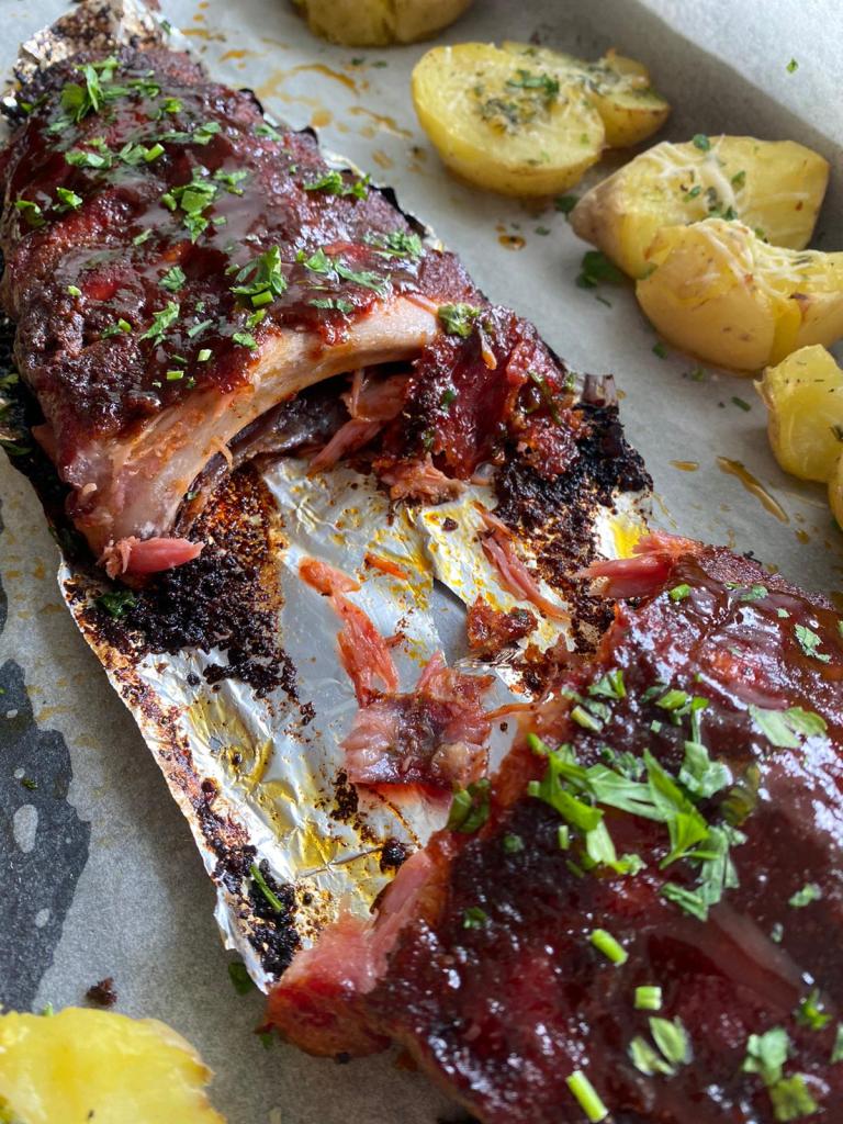 În tavă am pus 2 bucăți de folie de aluminiu, dimensiunea lor trebuie să fie potrivită pentru a putea împacheta bucățile de costiță. Am așezat câte o costiță pe fiecare folie și am condimentat bine, pe toate părțile, apoi am împachetat carnea și am pus-o pentru 2 ore și 20 minute la cuptorul preîncălzit la 170°C, pe grătarul din mijloc, funcția ventilație cu căldură de sus și jos.
