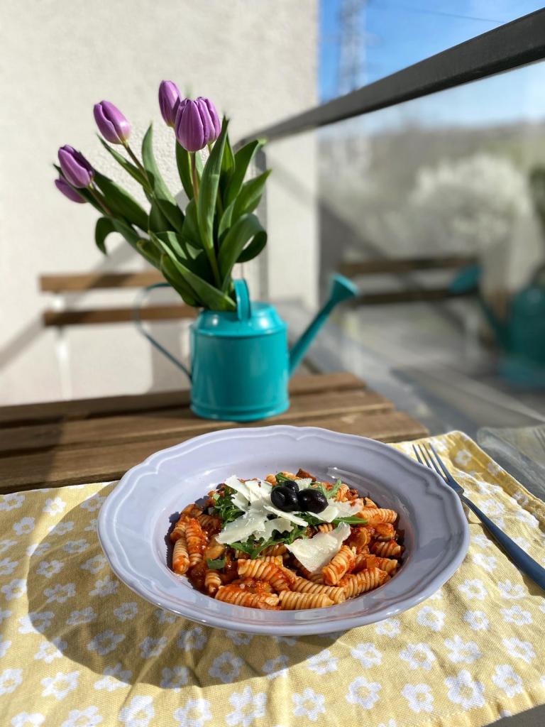 Deși sunt niște paste foarte simple, gustul este unul intens și bogat. O combinație plăcută între sosul de roșii, ceapa dulce, busuiocul tocat și rucola amăruie….o să-ți bucure papilele gustative!