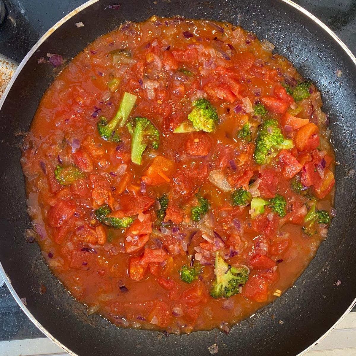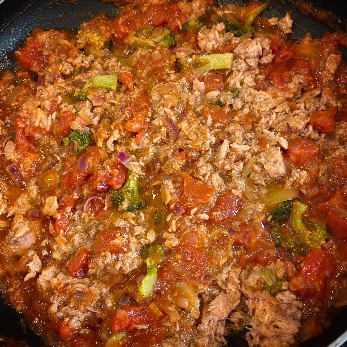 Cele două cepe trebuie să le tai mărunt, iar buchețelele de brocoli să le desfaci în bucăți cât mai mici. După ce s-a încins puținul ulei (nu trebuie mult) în tigaie, poți sa pui brocoliul și îl lași 2-3 minute la gătit, apoi adaugi ceapa tocată. Acum dacă crezi că e nevoie poți să mai pui un strop de ulei și lași la gătit cam 5 minute la foc mic, amestecând din când în când. Când ceapa și-a schimbat culoarea, adaugă sosul/ cuburile/ paste de roșii și condimentele. Poți să mai lași totul la fiert încă 5 minute, apoi adaugă conserva de ton (eu am pus doar jumătatea din uleiul din conservă, poate chiar mai puțin). După ce ai pus tonul mai lași 2 minute și e gata! Acum dacă crezi că mai e nevoie de puțin sos poți să completezi cu puțin bulion.