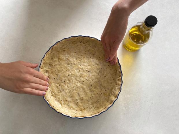 Tava în care îl vei pune o poți unge cu o lingură de ulei de măsline, apoi așează aluatul în ea, dacă este cazul, taie marginile prea mari.