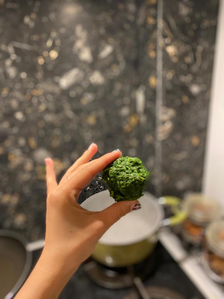 Într-o oală am pus apă la fiert, iar când a început să fiarbă am pus spanacul pentru fix 3 minute! După l-am clătit bine cu apă rece – ajută la păstrarea frumosă a culorii – l-am stors foarte bine de apă și l-am tocat cu un cuțit.