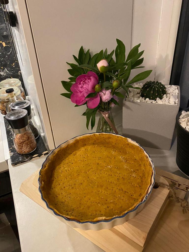 Am așezat foaia de aluat în forma de tartă (fără să mai pun ulei sau altă grăsime formă) și am făcut câteva găurele cu o furculiță. Peste aluat am pus o foaie de copt și boabe de fasole. Acest proces se numește copt la orb și ne ajută să nu se umfle aluatul, pentru că nu ne dorim asta!