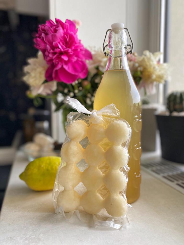 Ieri am trecut pe la bunica mea și spre bucuria noastră, are în spatele grădinii un soc mare! Am cules cu ea câteva flori și când am ajuns acasă m-am apucat de treabă! Din ingredientele folosite am obținut o stitclă de 1,200 ml de sirop și încă două punguțe pentru gheață! Cu acelecuburi voi aromatiza un pahar de proseco sau o limonadă!