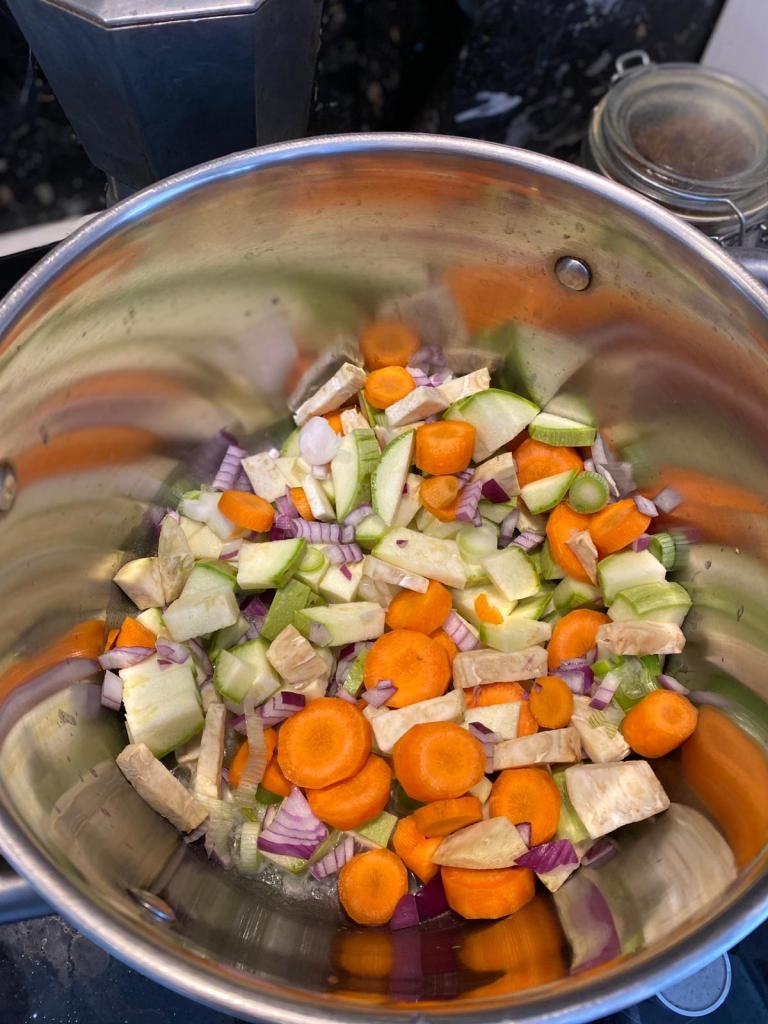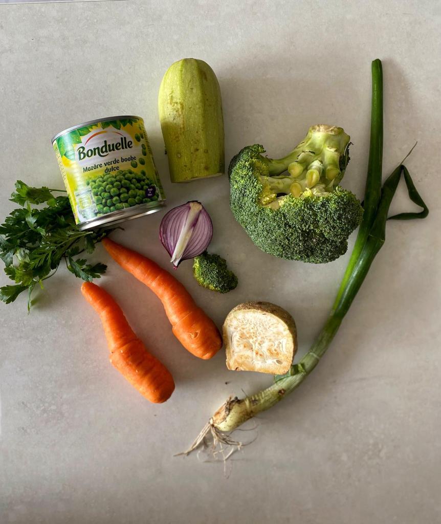 Într-o oală am pus untul și uleiul de măsline, iar când a fost topit untul am pus legumele (mai puțin brocoli și mazăre!). Le-am lăsat la gătit 3-4 minute, până au scăzut puțin în volum și și-au schimbat culoarea.