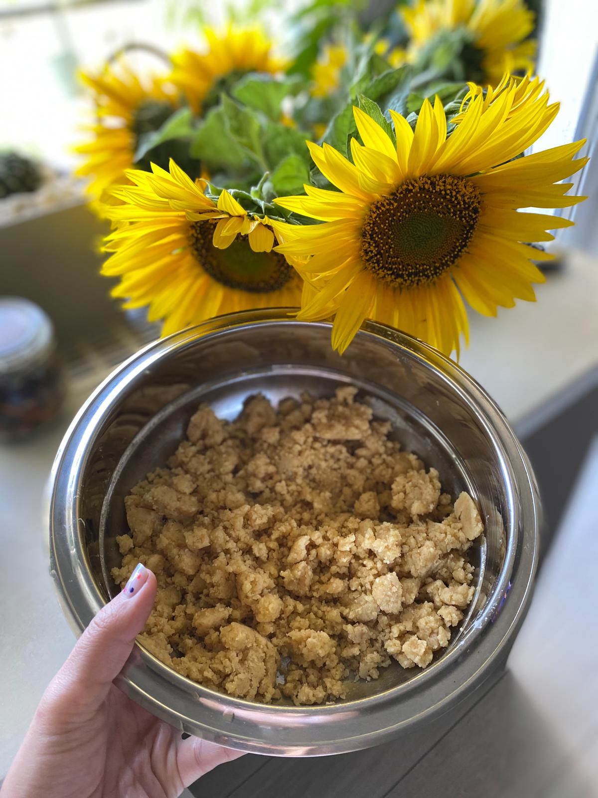 Prima dată am început să fac crusta: untul l-am topit într-o tigaie, iar ulterior l-am turnat peste făină și zahăr. Am amestecat bine cu o lingură, până am obținut textura unui nisip – se vede în prima poză de mai sus.