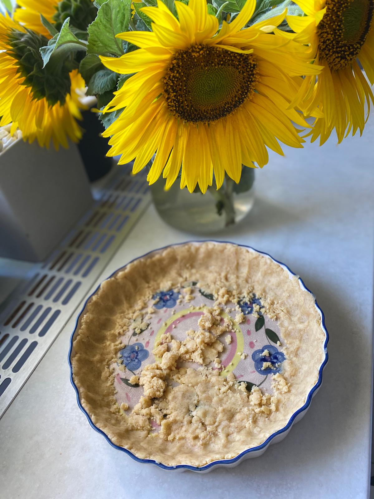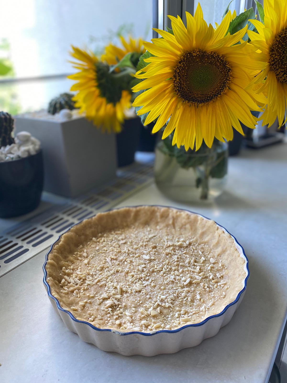 Acest blat nu trebuie frământat sau pus să stea la rece – cine are timp, nu? 😅 Am început să pun cu mână pe marginile tavei și treptat spre mijloc, până am umplut toata tava. Cu mâna am presat ușor, astfel încât să obțin un blat cât mai uniform. Cu o furculiță am înțepat din loc în loc și am presărat migdalele sfărmate. Tava am pus-o la cuptor pentru 15 minute pe 180 grade, funcția ventilație și căldură sus și jos.