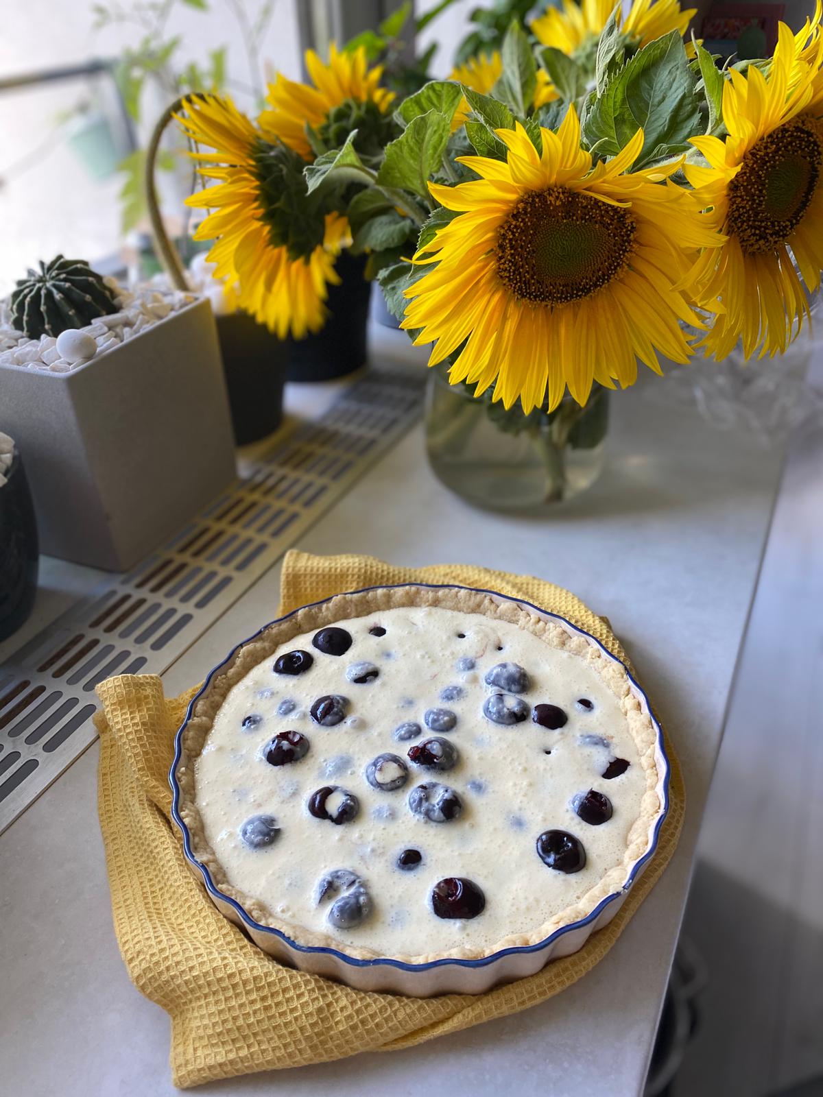 Până acum sigur s-a copt și blatul așa că poți așeza cireșele în tavă, peste blat și apoi să torni compoziția pentru umplutură.