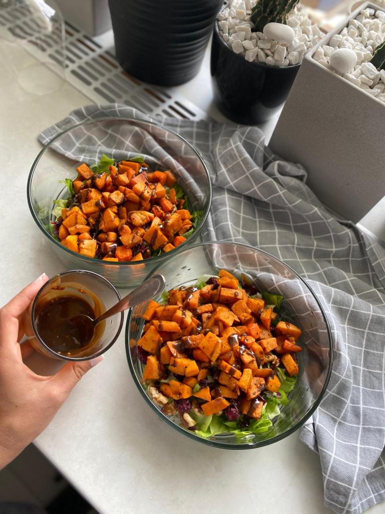 Pentru dressing am amestecat bine – bine toate ingredientele și am pus 1 linguriță peste salata din bol.