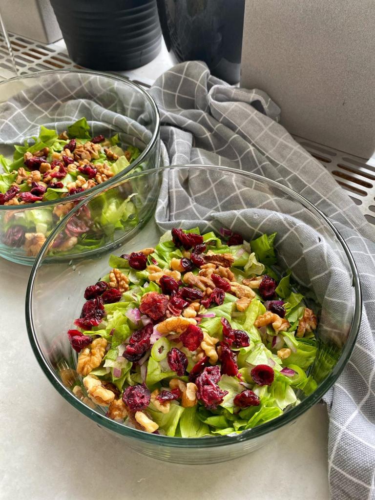 Separat, într-un bol am așezat salata pe care am amestecat-o bine cu puțin suc de la lămâie și ceapa roșie tăiată mărunt. Peste am așezat nucile și merișoarele.