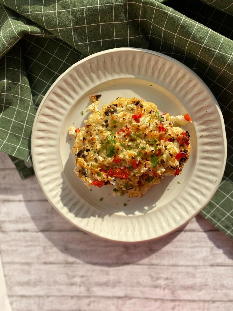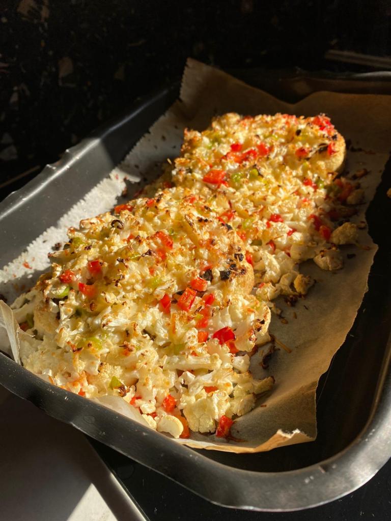 Știu că sună ciudat, dar nu știam cum altfel să îi spun 😅. După cum sugerează și numele am tăiat conopida în 2 bucăți și am făcut un topping deasupra.