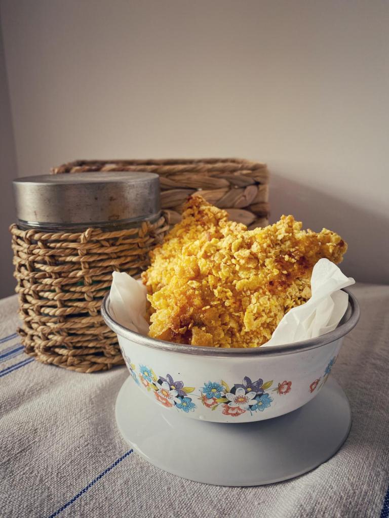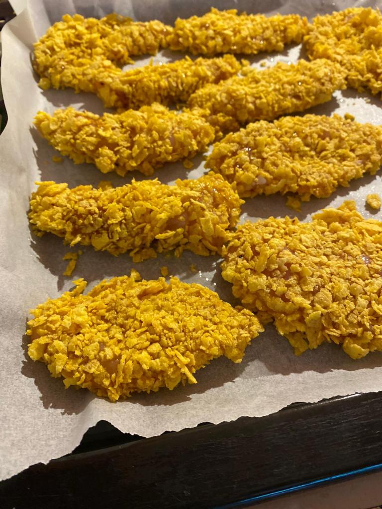 Fulgii de porumb i-am zdrobit puțin înainte, astfel încât să se lipeasă mai bine de bucățile de carne.