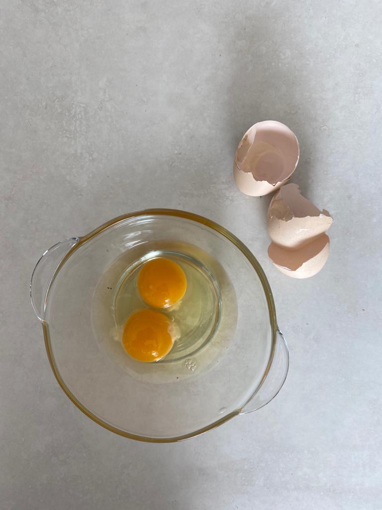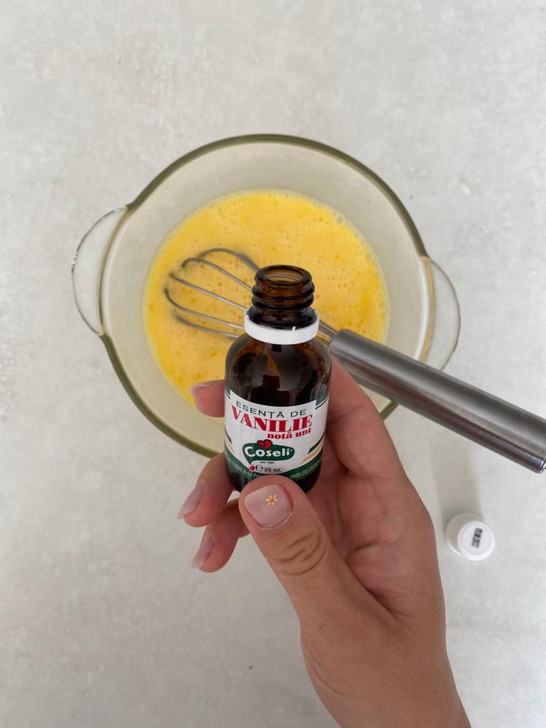 Într-un bol am pus făina, zahărul, praful de copt și scorțisoara. Cu un tel am amestecat bine toate ingredientele. Separat, am pus cele două ouă, pe care le-am amestecat cu telul, am turnat laptele, vanilia și untul topit. Se amestecă totul, până se omogenizează ingredientele umede.