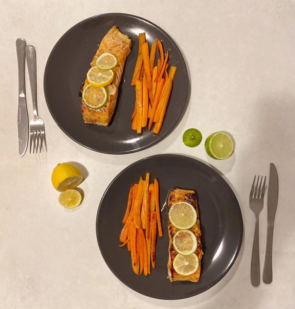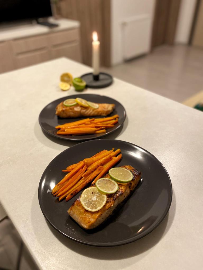 Când au fost gata morcovii și somonul, le-am așezat pe farfurie și am decorat bucățile de somon cu feliuțe de lime și lămâie!