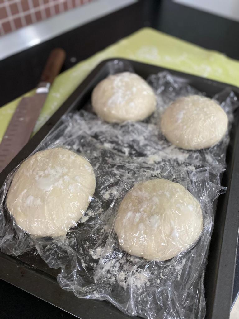 Am pregătit o tavă cu făină presarată, am așezat bilele de aluat, am pus și deasupra făină și le-am lăsat la dospit timp de 8 ore. Tava am acoperit-o cu folia alimentară și prosopul de bucătărie.