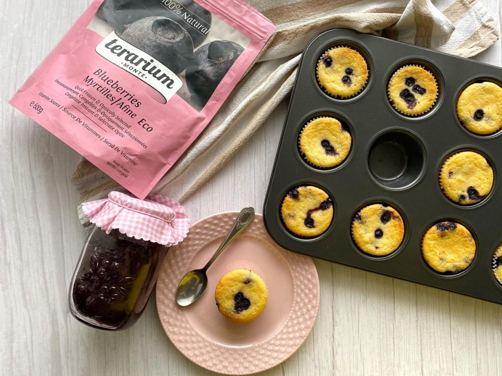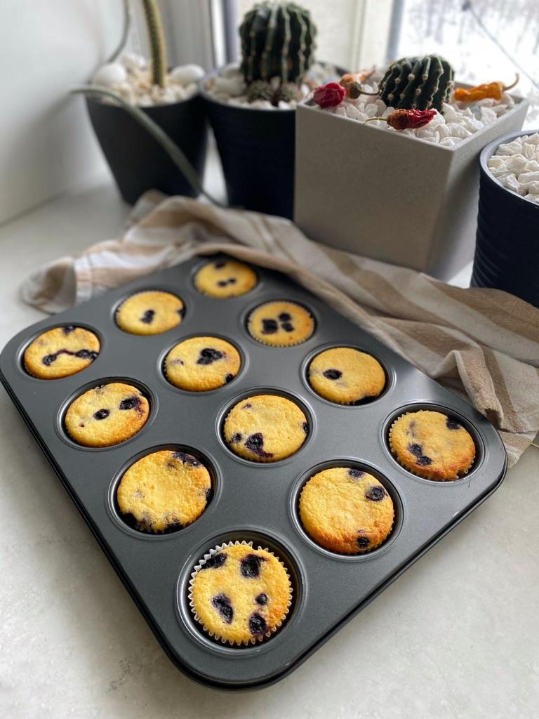 Cu o lingură am pus compoziția în forme, am pus 3-4 afine și încă puțină compoziție apoi din nou câteva afine. Tava am pus-o pentru 30 minute la cuptorul preîncălzit la 180 grade, pe funcția ventilație, pe raftul din mijloc. Când au trecut cele 30 minute am făcut testul scobitorii și am scos tava!