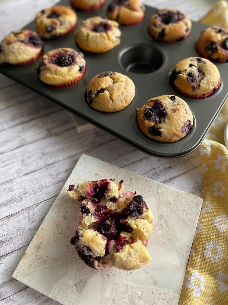 În tava specială pentru brioșe am pus hârtiuțele de copt și le-am umplu cu aproximativ 2 linguri de compoziție, am decorat frumos cu câteva afine și bucăți de mure.