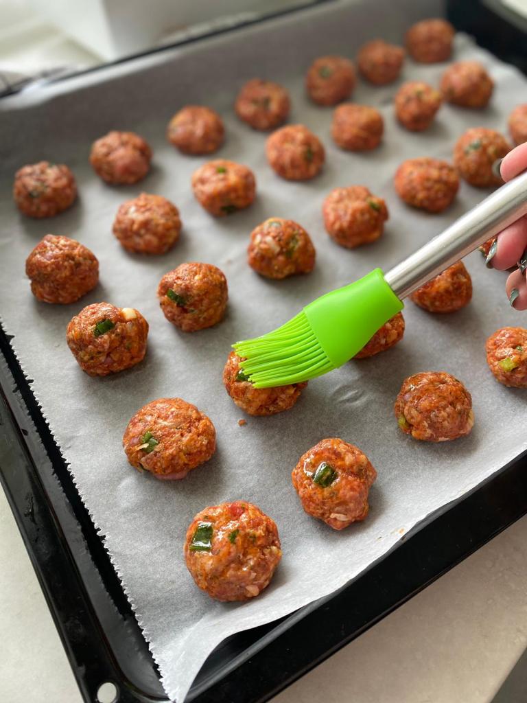 Cum am spus și puțin mai sus, ingredinetele se amestecă bine, iar apoi cu mâine umede formăm chifteluțele pe care le așezăm într-o tavă cu hârtie de copt. Într-un vas am pus foarte puțin ulei și cu o pensulă am uns fiecare chifteluță.