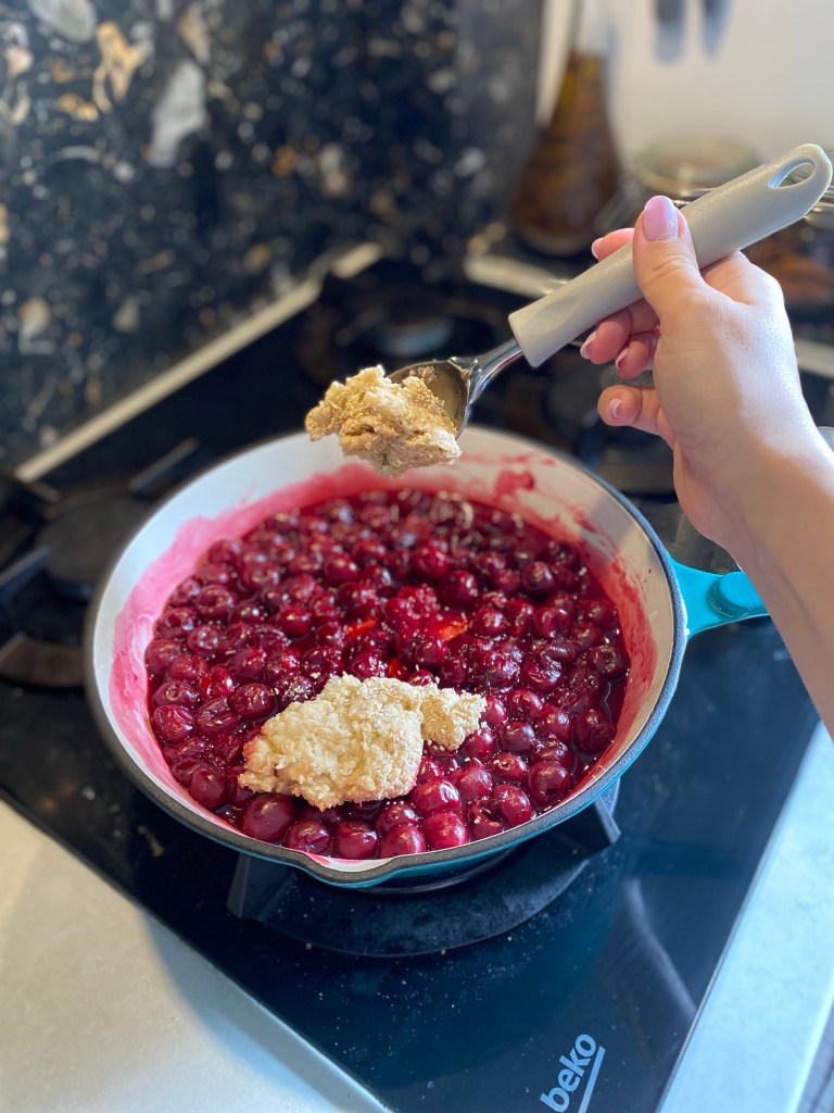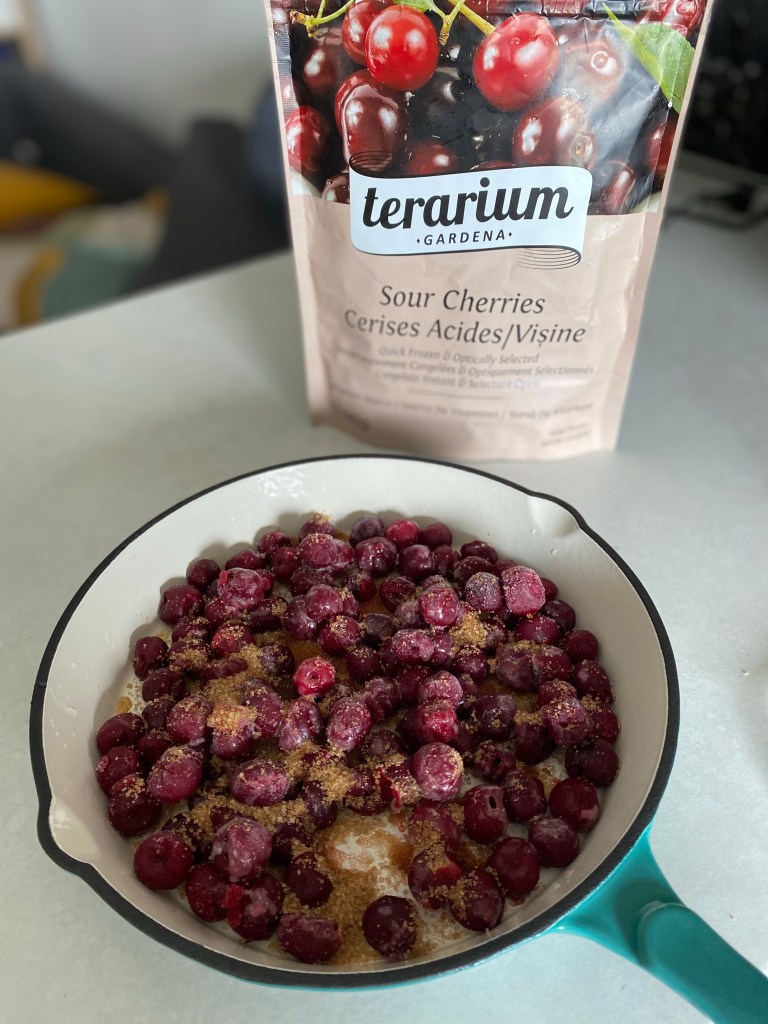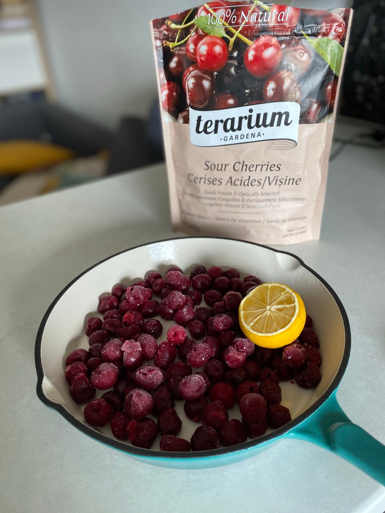 Vișinele le-am pus cu zahărul și lămâia în tigaie, pe foc până s-a topit zahărul. Acum am adăugat și lingura de amidon, am amestecam bine și am oprit focul. Tot sucul de la visine se va lega de la amidon, iar la final arată ca un jeleu.