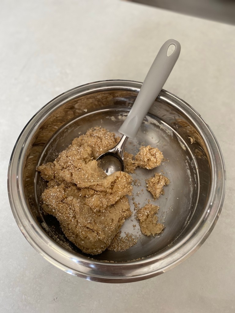 Ingredientele uscate se amestecă bine, peste am turnat untul topit, am amestecat și am pus puțin lapte pentru a lega un aluat.