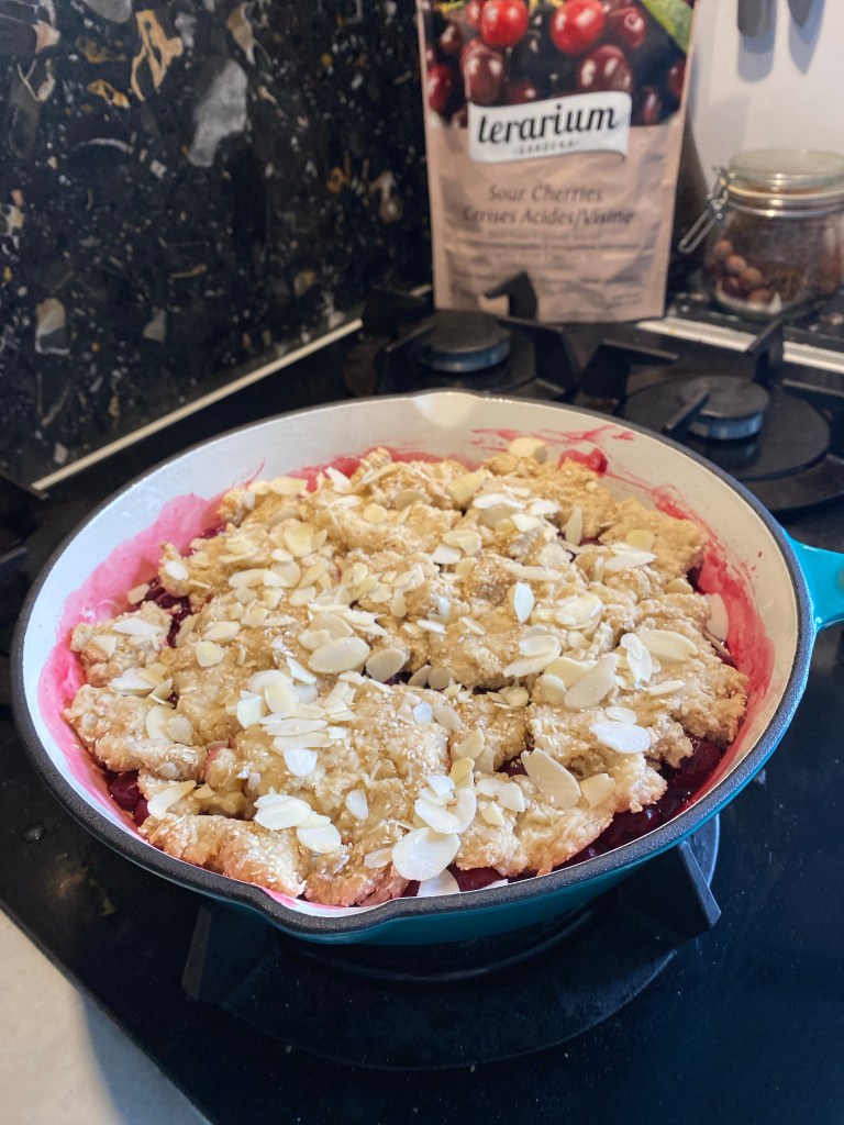 Acest aluat obținut se pune peste vișine, am presărat câteva migdale blansate și am pus tava la cuptorul preîncălzit la 180 grade pe ventilație, 35 minute.