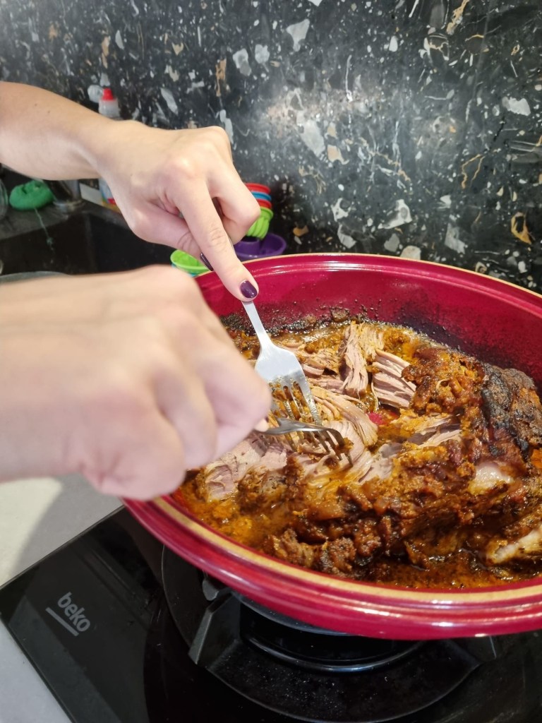 Când este gata, desfacem toată carnea cu doua furculițe și amestecam cu sosul! Promit ca este mega ultra delicios!