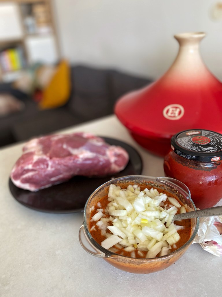 Bucata de ceafă de porc se așează în vasul Tajine și se toarnă compoziția peste, având grija ca sosul sa ajungă și sub carne.