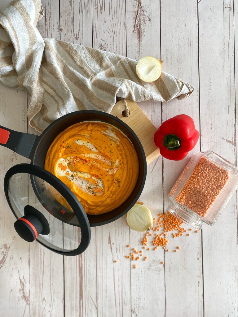 Am pus untul in cratiță și toate legumele tăiate. Le-am lăsat să se gătească sub capac cam 5 minute, verificând sa nu se ardă. Acum am adăugat apa cât sa acopere peste cu un deget și am lăsat totul la fiert aproximativ 20 minute. Atunci am adăugat lintea roșie pe care am spălat-o bine înainte.
