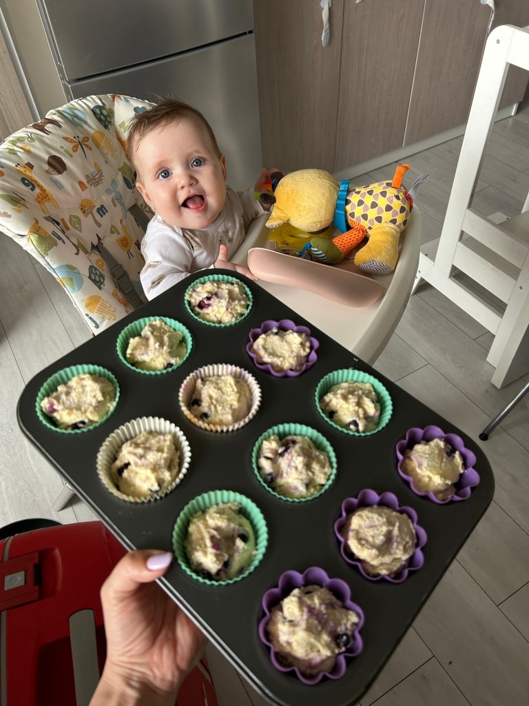Chiar înainte de a pun compoziția in forme, pun afinele congelate și le amestec ușor.