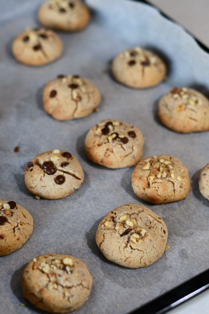 Prima dată am măcinat mixul de alune, ulterior am adăugat toate ingredinetele in robotul de bucătărie si le-am amestecat. Din aluatul obținut am format cu o linguriță aproximativ 20 de biscuiți. I-am aplatizat ușor pe tava de copt si i-am decorat cu nucă măcinată si chocolate chips. Puteți folosi si altele: fulgi de cocos, bomboane m&m’s