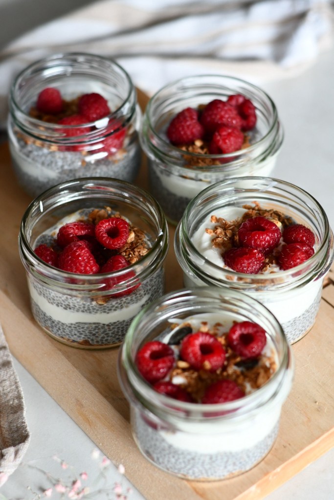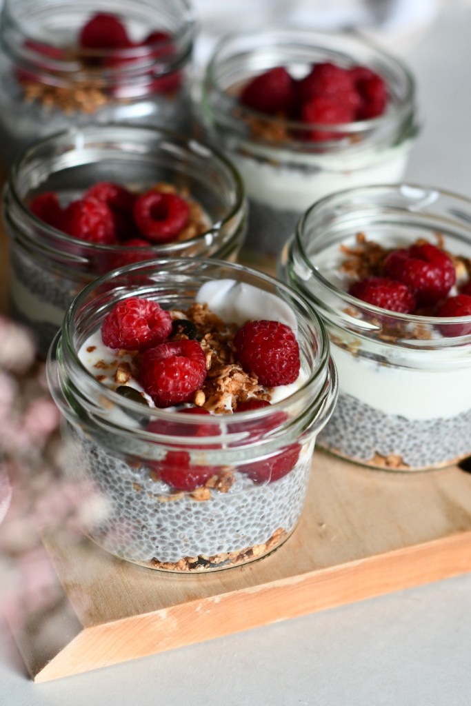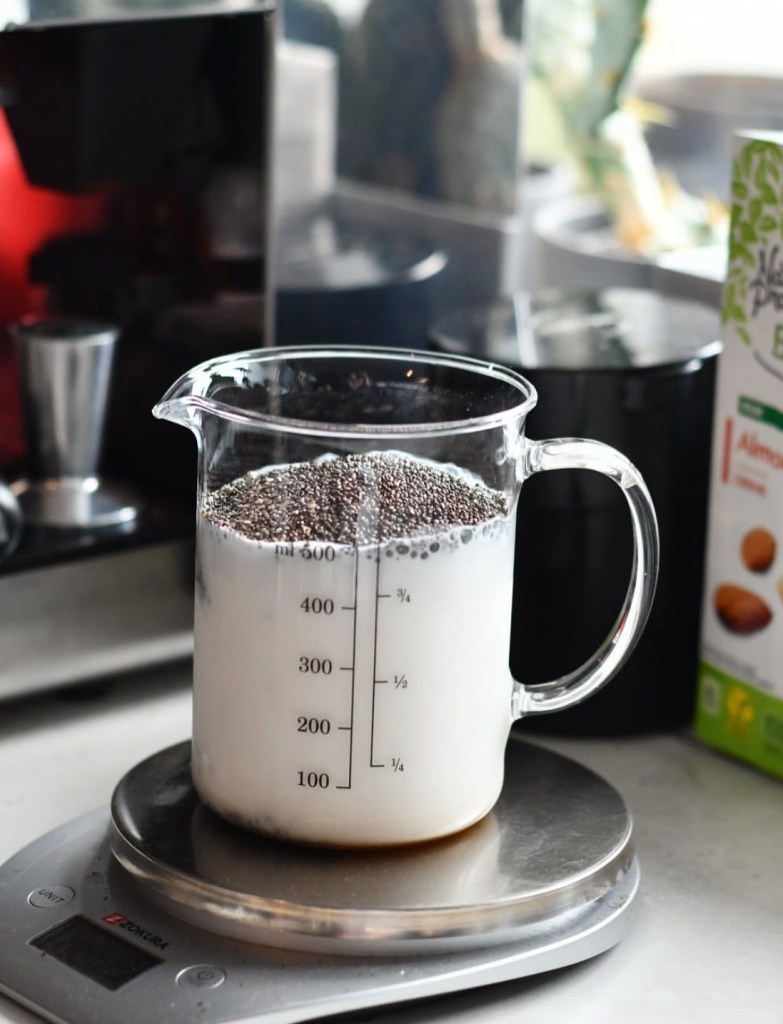 Semințele de chia se amestecă cu băutura vegetală și se lasă la hidratat 10-15 minute, cât să se lege pentru a putea fi asamblate borcanele. Asta e tot!